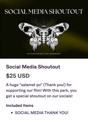 Our largest expense includes the creation of a full functional and practical moth-like creature, a key element of our story. Not only does it weave the Filipino folklore into the narrative, but it also creates surreal moments that parallels Liezel’s journey through family secrets and self-discovery.